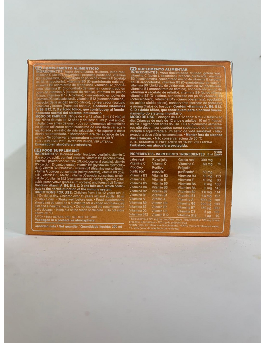 Suplemento con un alto contenido en 12 vitaminas con Jalea Real y Propóleo. Las vitaminas B6, B3, B5, B9, B7, B1 y vitamina B12 contribuyen al normal funcionamiento del metabolismo energético, del sistema nervioso, y del sistema inmune, además de a la normal producción de glóbulos rojos (EFSA). Indicado para niños y adolescentes. Con sabor a frutas del bosque.