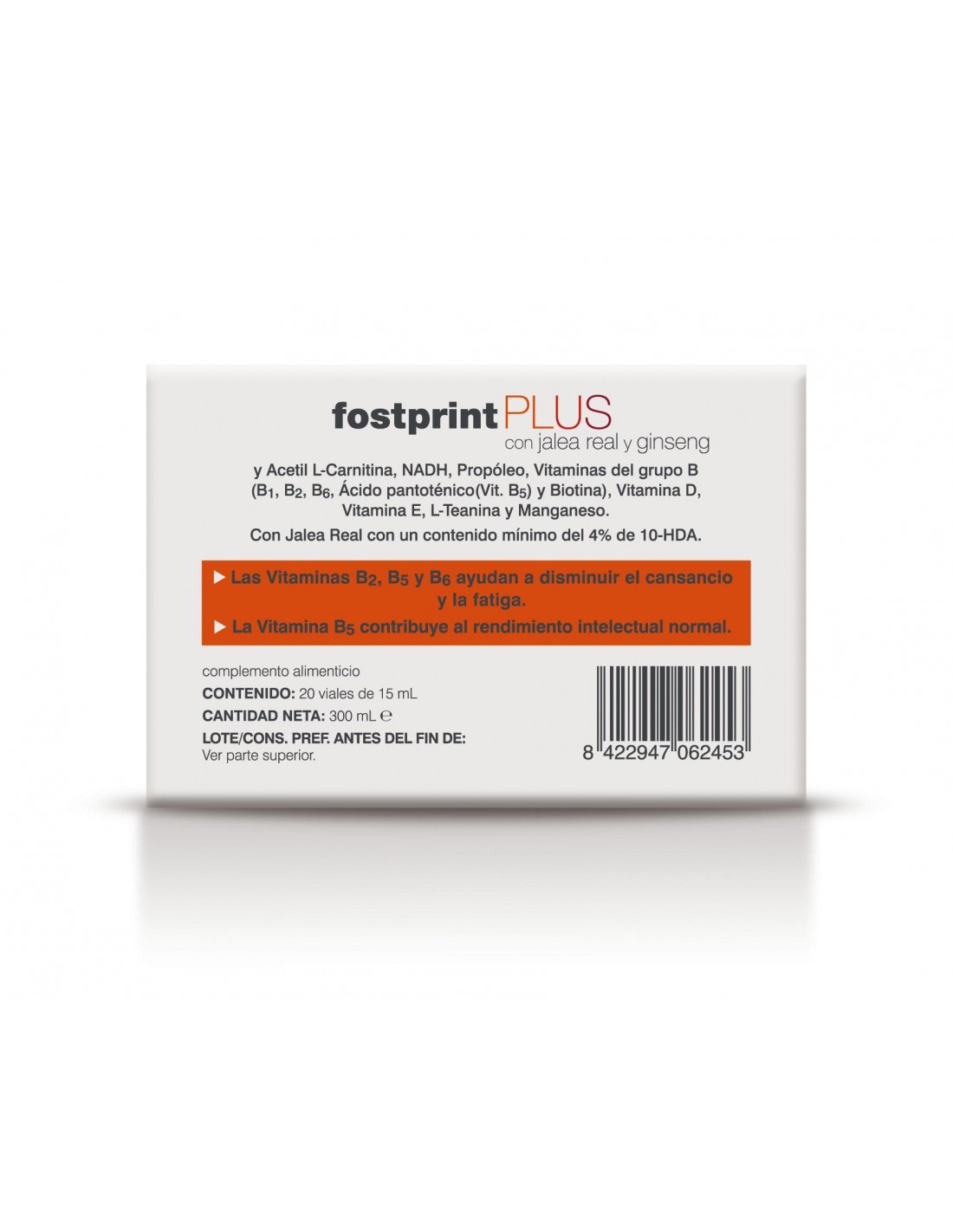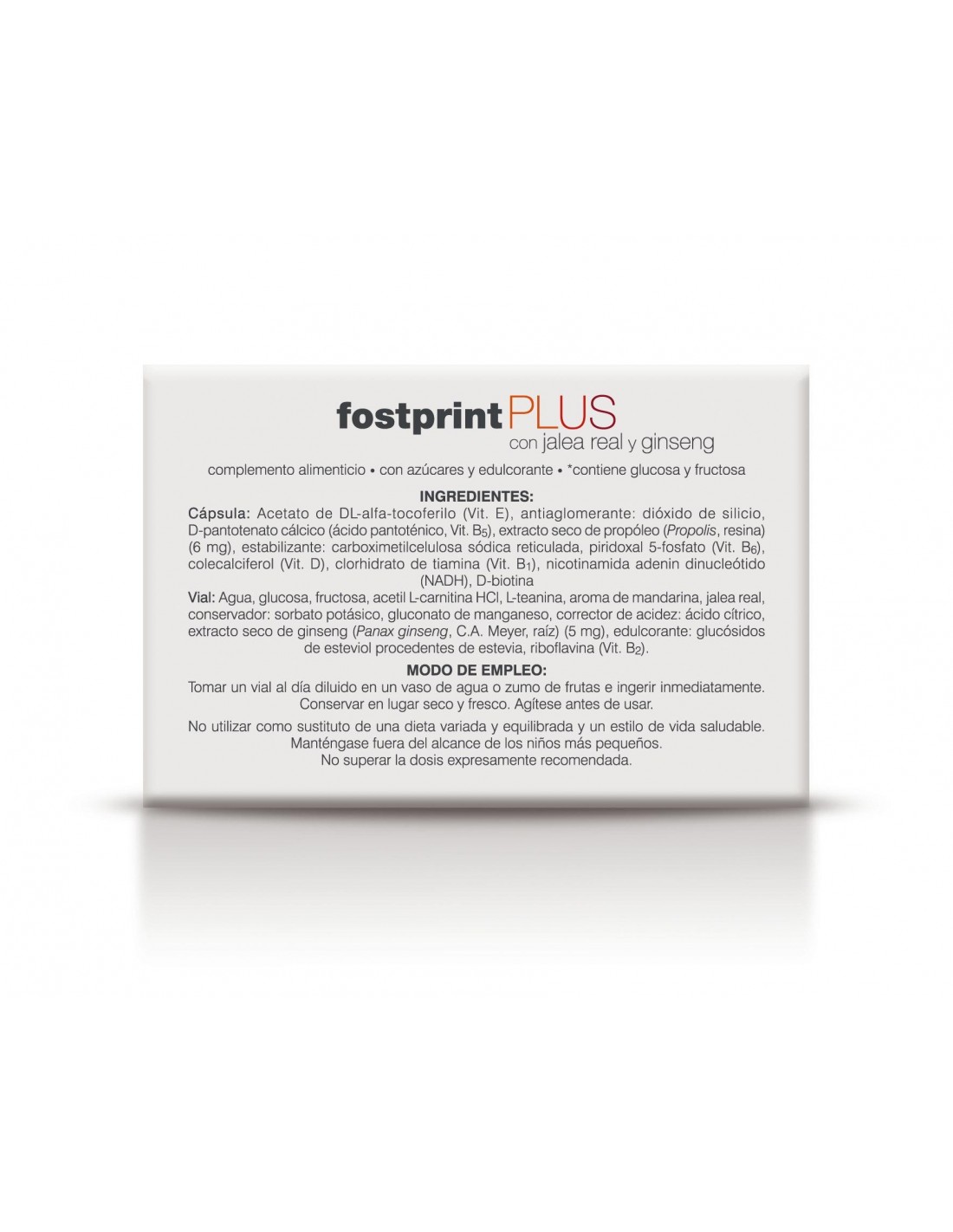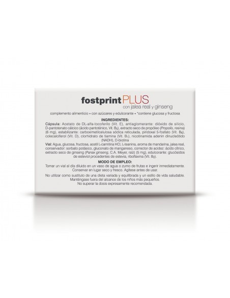 Fost Print Plus de Soria Natural es un complemento alimenticio. Con Ginseng y Acetil L-Carnitina, NADH, Jalea Real liofilizada, Propóleo, Vitaminas del grupo B (B1, B2, B3, B6, Ácido pantoténico y Biotina), Vitamina D, Vitamina E, L-Teanina y Manganeso. Las vitaminas B2, B3, B5, B6 ayudan a disminuir el cansancio y la fatiga. La vitamina B5 contribuye al rendimiento intelectual normal. 210 mg de Jalea real liofilizada equivalen a 1 g de Jalea real fresca.