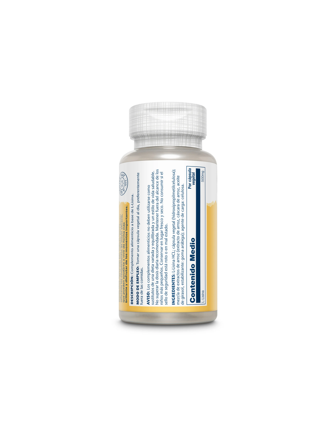 L-lisina, cápsula de celulosa vegetal, mezcla de extracto de arroz integral, agente de carga: celulosa.