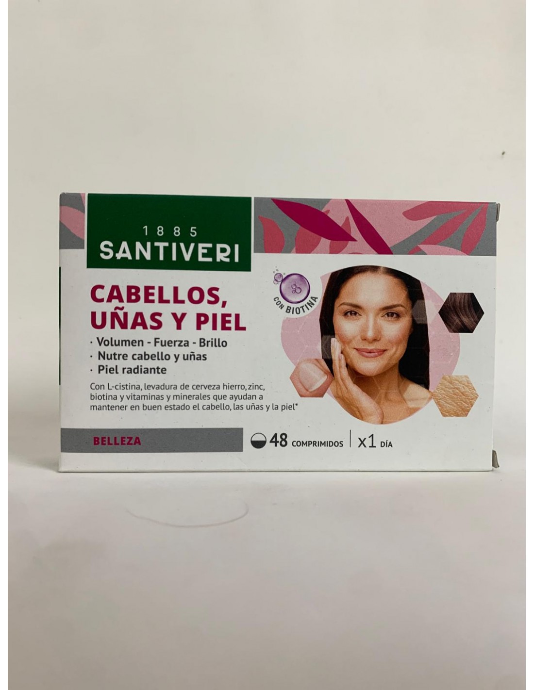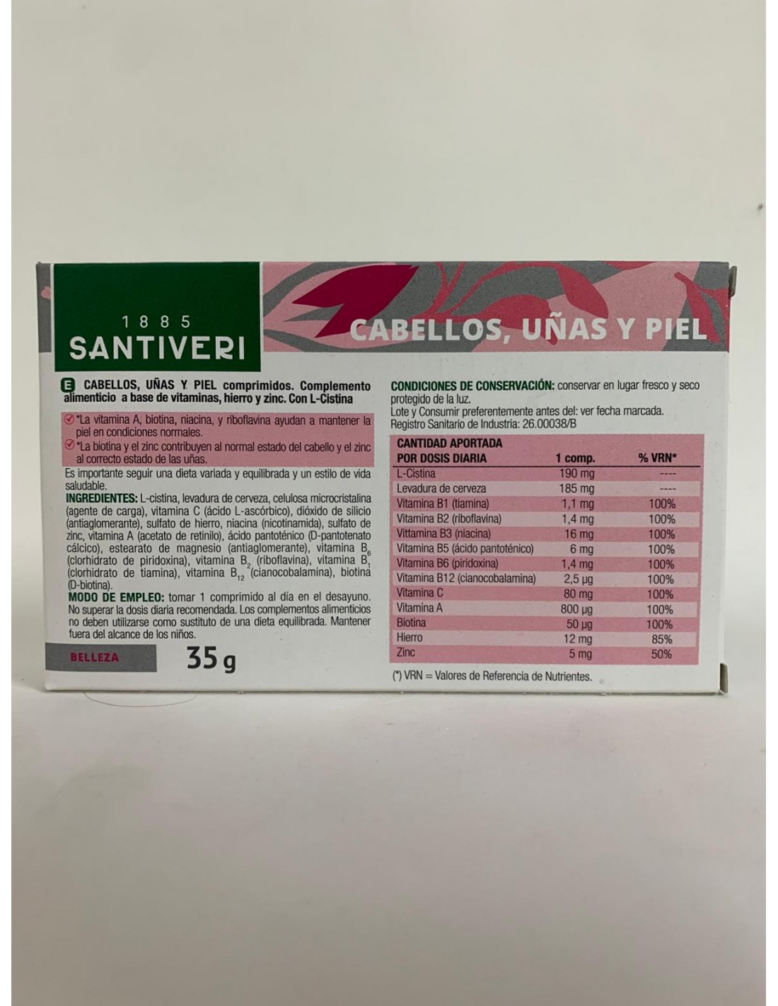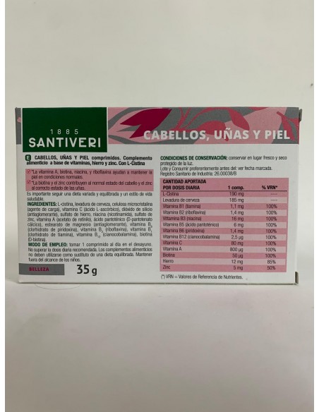 Complemento alimenticio con vitamina A, niacina y riboflavina que contribuyen al mantenimiento de la piel, así como el zinc, que a su vez contribuye al mantenimiento de las uñas y el cabello en condiciones normales.