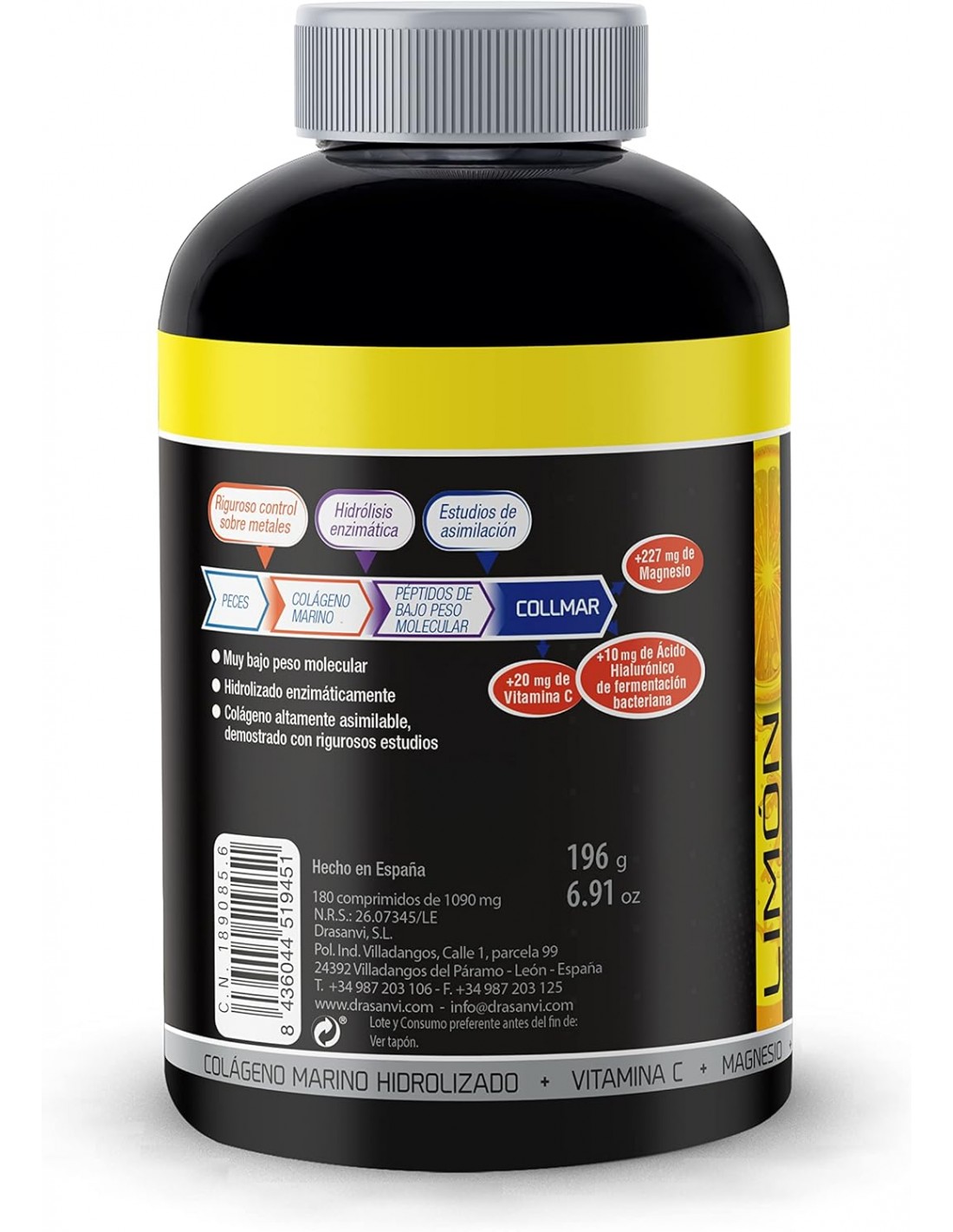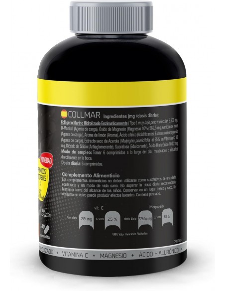 El colágeno utilizado en Collmar colágeno marino con magnesio (sabor limón) ha sido sometido a un proceso único que consiste en fragmentarlo en moléculas más pequeñas, llamadas péptidos, para que sean más fácilmente asimilables por el organismo. Este proceso se ha realizado por hidrólisis enzimática. De esta forma conseguimos romper el colágeno en lugares específicosfacilitando su absorción.