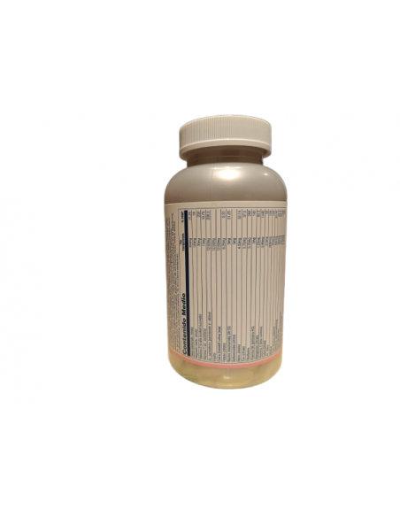 Calcio (carbonato, citrato), Magnesio (óxido, citrato), Vitamina E (tocoferil succinato), Vitamina C (ácido L- ascórbico), Ácido Pantoténico (calcio pantotenato), Inositol, Aceite de semilla de Grosellero negro( Ribes nigrum), Fosfatidilcolina, Potasio (cloruro de potasio), Niacina (niacinamida) (vitamina B3), Bioflavonoides, Hierro (citrato), Zinc (citrato), Riboflabina (vitamina B2), Vitamina B6 piridoxina HCI):agente de carga: celulosa, Manganeso (citrato de manganeso), Beta Caroteno (Dunallella salina), Cobre (citrato): antiaglomerante: Ácido Esteárico, Estearato de Magnesio, Ácido Fólico (vitamina B9), Biotina, Yodo, Selenio (l selenometionina), Cromo (picolinato), Vitamina D3 (colecalciferol), Vitamina B12 (cianocobalamina).