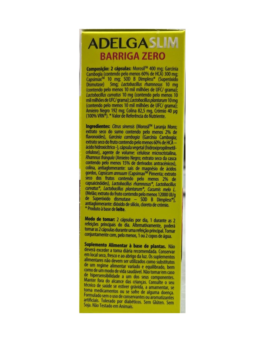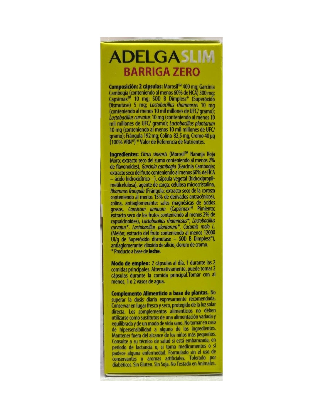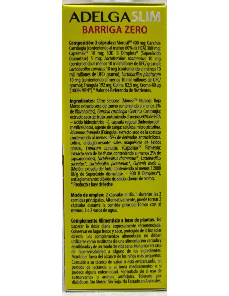 Citrus sinensis (MorosilTM Naranja Roja Moro: extracto seco del zumo conteniendo al menos 2% de flavonoides), Garcinia cambogia (Garcinia Cambogia: extracto seco del fruto conteniendo al menos 60% de HCA – ácido hidroxicítrico –), cápsula vegetal (hidroxipropilmetilcelulosa), agente de carga: celulosa microcristalina, Rhamnus frangula (Frángula: extracto seco de la corteza conteniendo al menos 15% de derivados antracénicos), colina, antiaglomerante: sales magnésicas de ácidos grasos, Capsicum annuum (CapsimaxTM Pimienta: extracto seco de los frutos conteniendo al menos 2% de capsaicinoides), Lactobacillus rhamnosus, Lactobacillus curvatus, Lactobacillus plantarum, Cucumis melo L. (Melón: extracto del fruto conteniendo al menos 12000 UI/g de Superóxido dismutase – SOD B Dimpless®), antiaglomerante: dióxido de silicio, cloruro de cromo.