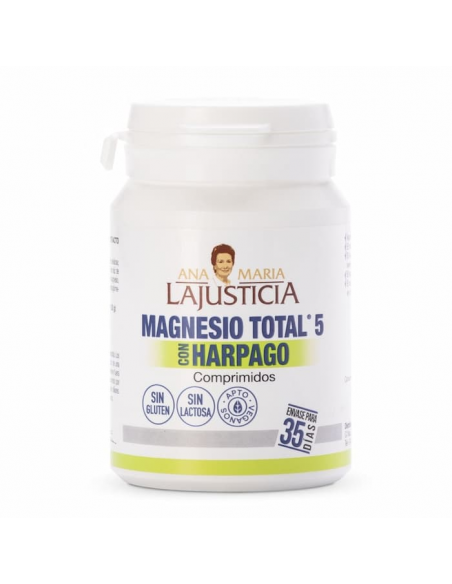 Magnesio total 5 con harpago de Ana María Lajusticia contiene extracto seco de harpagofito y 5 fuentes de Magnesio, entre ellas citrato de magnesio y bisglicinato de magnesio, que presentan una elevada biodisponibilidad y absorción.
