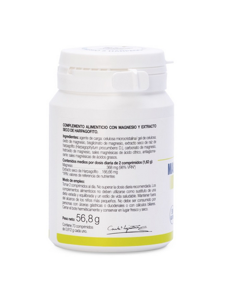 Agente de carga: celulosa microcristalina/ gel de celulosa: óxido de magnesio, bisglicinato de magnesio, extracto seco de raíz de harpagofito (Harpagophytum procumbens D.), carbonato de magnesio, hidróxido de magnesio, sales magnésicas de ácido cítrico, antiaglomerante: sales magnésicas de ácidos grasos.