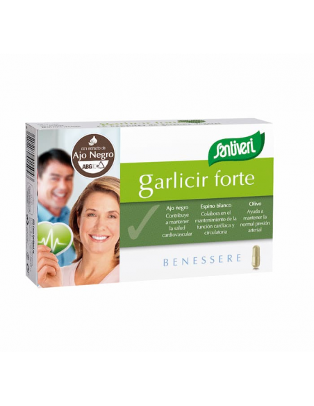 Garlicir de Santiveri es un complemento alimenticio a base de extractos de ajo negro, olivo y espino blanco.