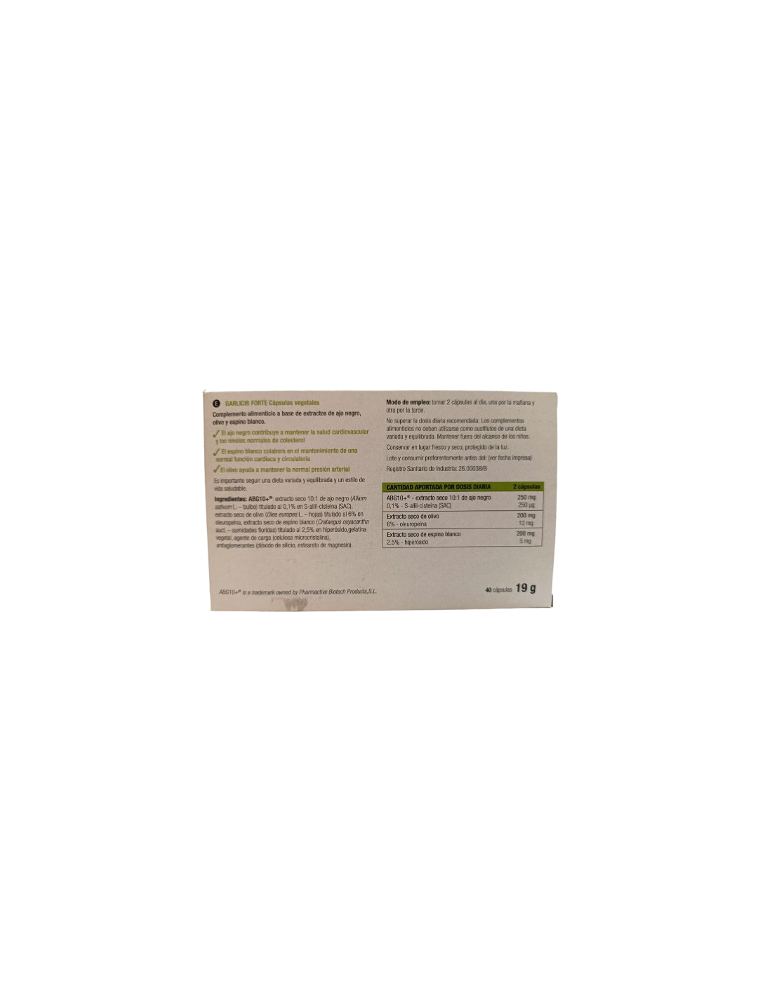 250 mg de extracto ABG10+® extracto seco 10:1 de ajo negro (250 µg de S-allil cisteína (SAC), 200 mg de extracto seco de olivo (12 mg oleuropeína) y 200 mg de extracto seco de espino blanco (5 mg hiperósido).