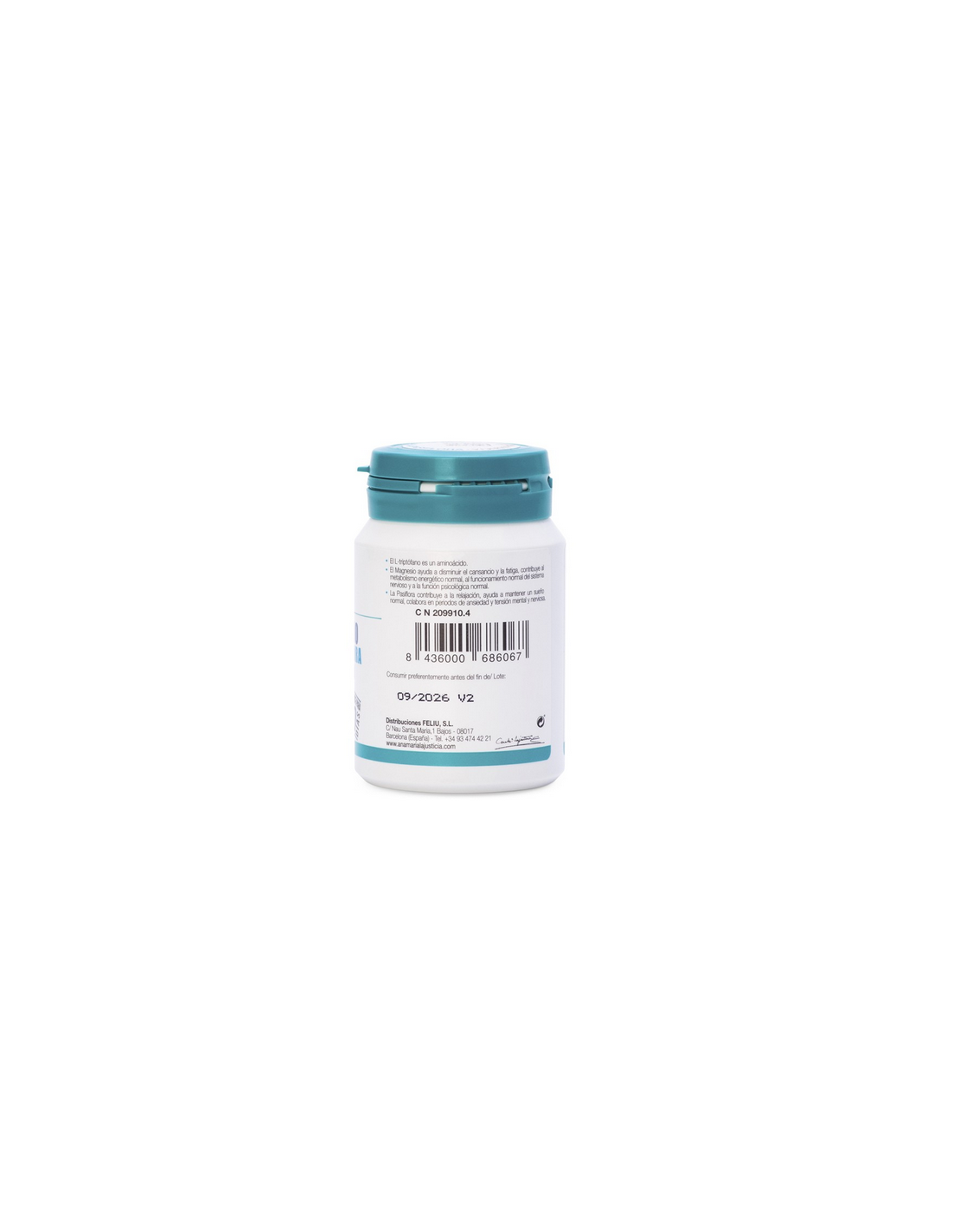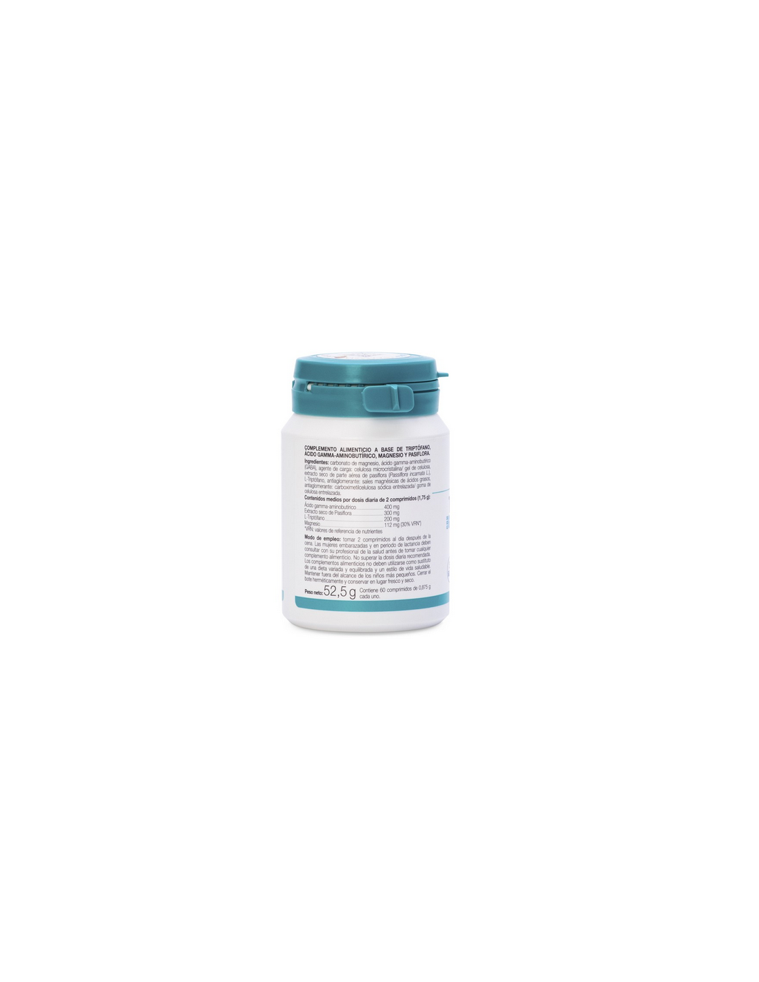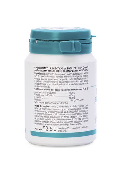Ácido gamma-aminobutírico 400mg: extracto seco de Pasiflora 300 mg: L-Triptófano 200 mg: Magnesio 112 mg. Excipientes.