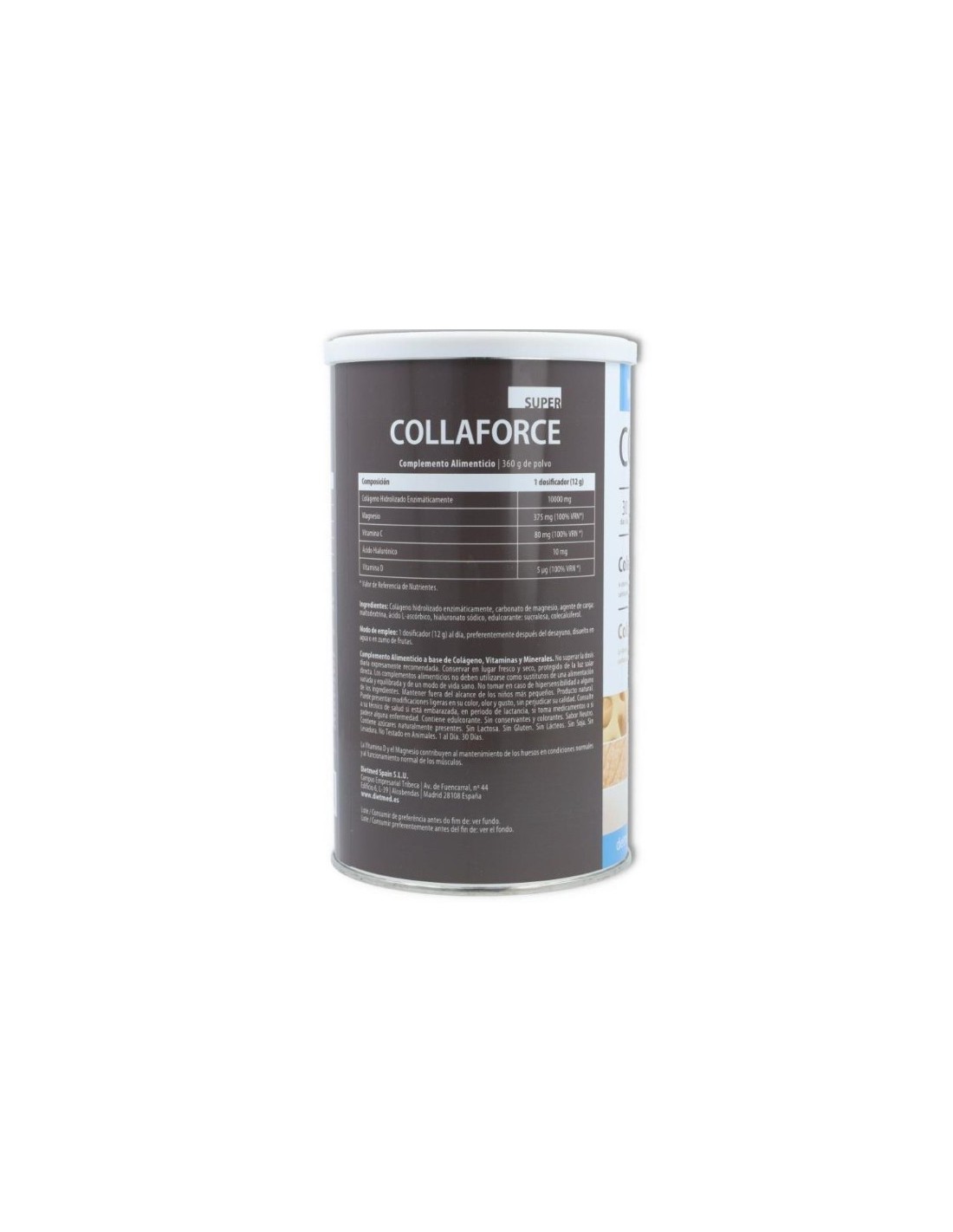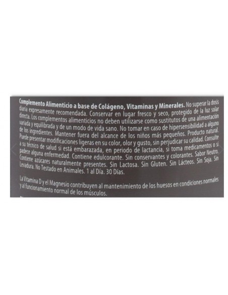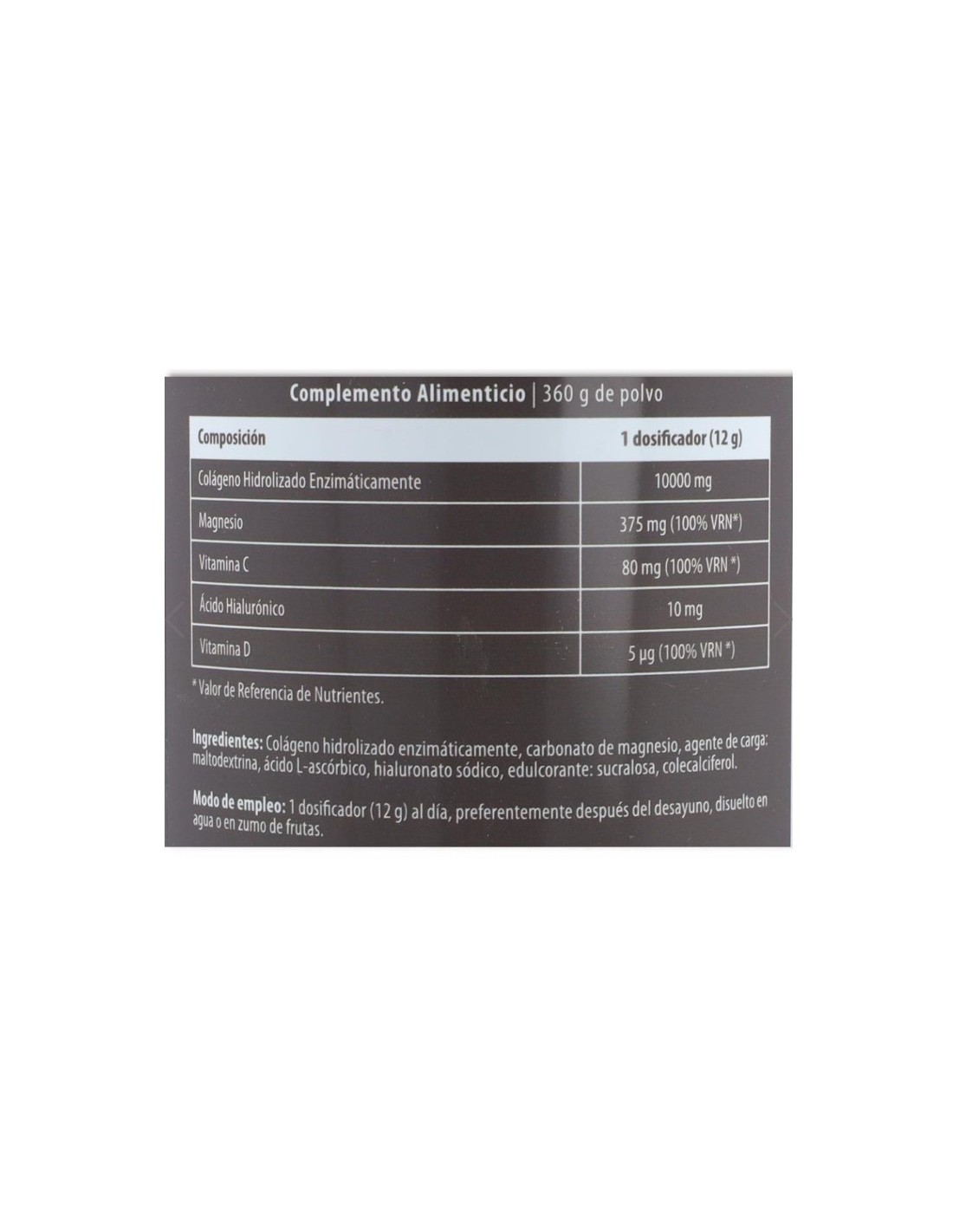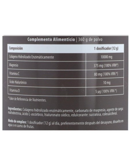 COMPOSICIÓN: 1 medida (12 g): Colágeno Hidrolizado Enzimáticamente 10000 mg, Magnesio 375 mg (100% VRN*), Vitamina C 80 mg (100% VRN *), Ácido Hialurónico 10 mg, Vitamina D 5 µg (100% VRN *). * Valor de Referencia de Nutrientes.