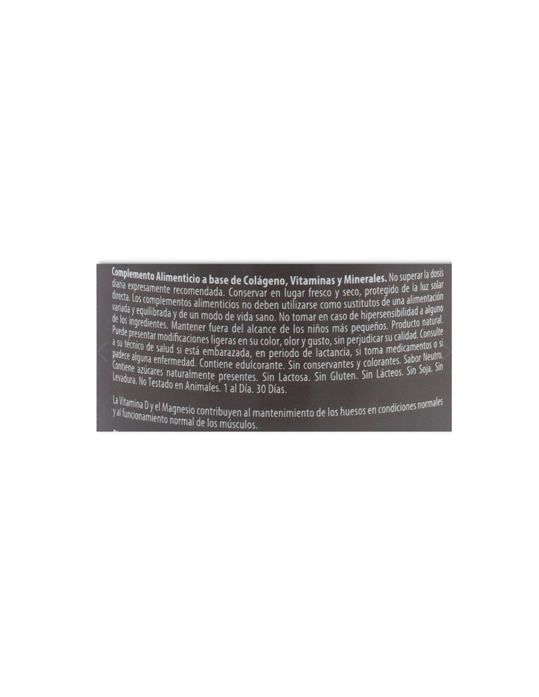 INGREDIENTES: Colágeno Hidrolizado Enzimáticamente, carbonato de magnesio, agente de carga: maltodextrina, acido L-ascórbico, hialuronato sódico, edulcorante: sucralosa, colecalciferol.
