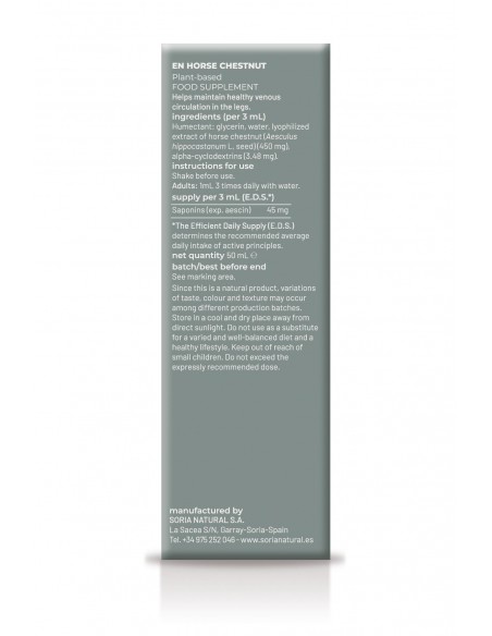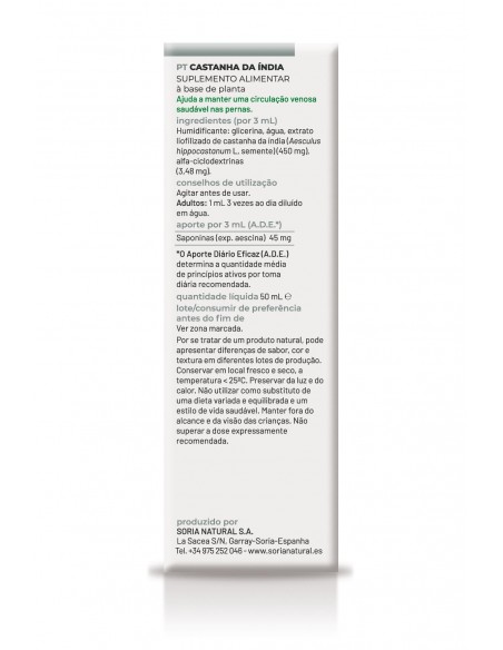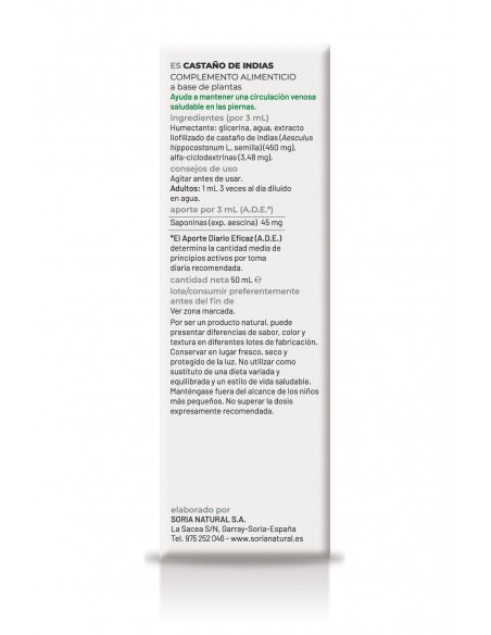 El extracto de castañas de indias de Soria Natural favorece el tono de la pared venosa, determinando que las venas se contraigan y disminuya la congestión sanguínea. Tiene principios activos que le dan acción antiinflamatoria. Fortalece las células que forman la pared capilar ayudando a disminuir la permeabilidad y desaparición de edemas o hinchazones. Recomendado en hemorroides, edemas y hemorragias. Se puede emplear como preventivo de flebitis y trombosis por su acción anticoagulante. Ademas, es útil en la hipertrofia de próstata ayudando a desinflamarla, rebajarla de tamaño y facilitando la expulsión de orina.