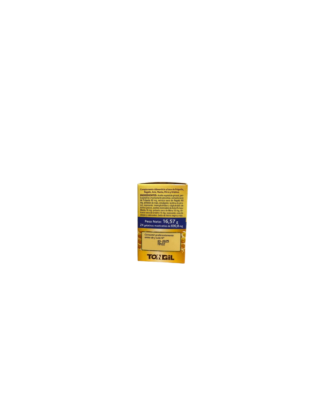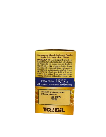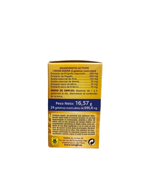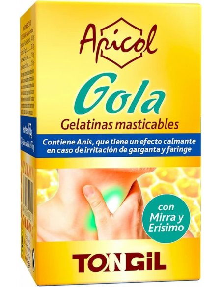 Apicol gola masticable de Tongil es un complemento alimenticio para aliviar los malestares de gargantas, en formato perlas. Compuesto por plantas, aceites esenciales y própolis, que se distribuyen en la boca y en la garganta.