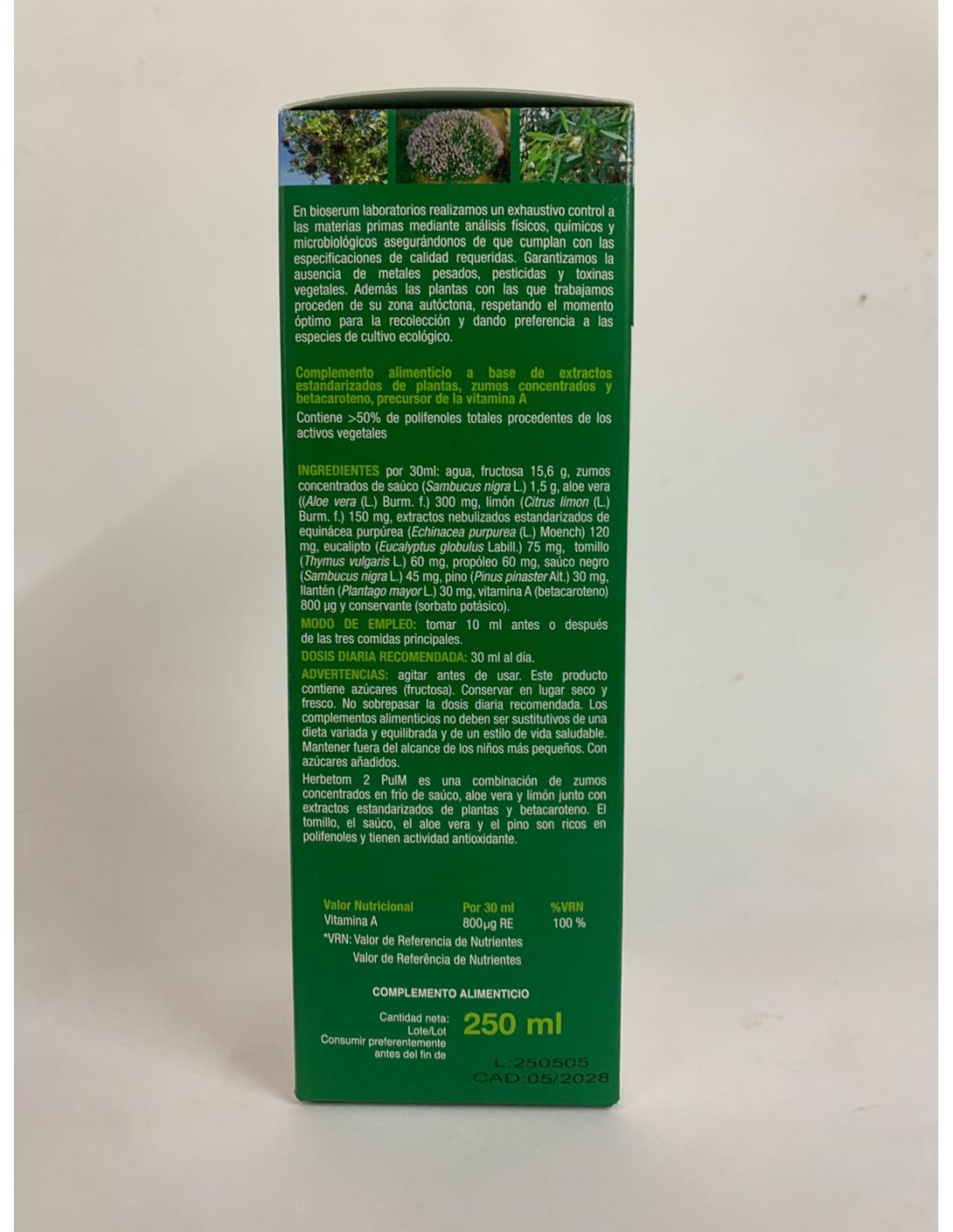 Agua, fructosa, zumos concentrados de saúco (Sambucus nigra L.) 1,5 g, aloe vera (Aloe vera (L.) Burm. f.) 300 mg, limón (Citrus limon (L.) Burm. f.) 150 mg, extractos nebulizados estandarizados de equinácea purpúrea (Echinacea purpurea (L.) Moench) 120 mg, eucalipto (Eucalyptus globulus Labill.) 75 mg, tomillo (Thymus vulgaris L.) 60 mg, propóleo 60 mg, saúco negro (Sambucus nigra L.) 45 mg, pino (Pinus pinaster Ait.) 30 mg, llantén (Plantago mayor L.) 30 mg, vitamina A (beta caroteno) 800 µg y conservante (sorbato potásico).
