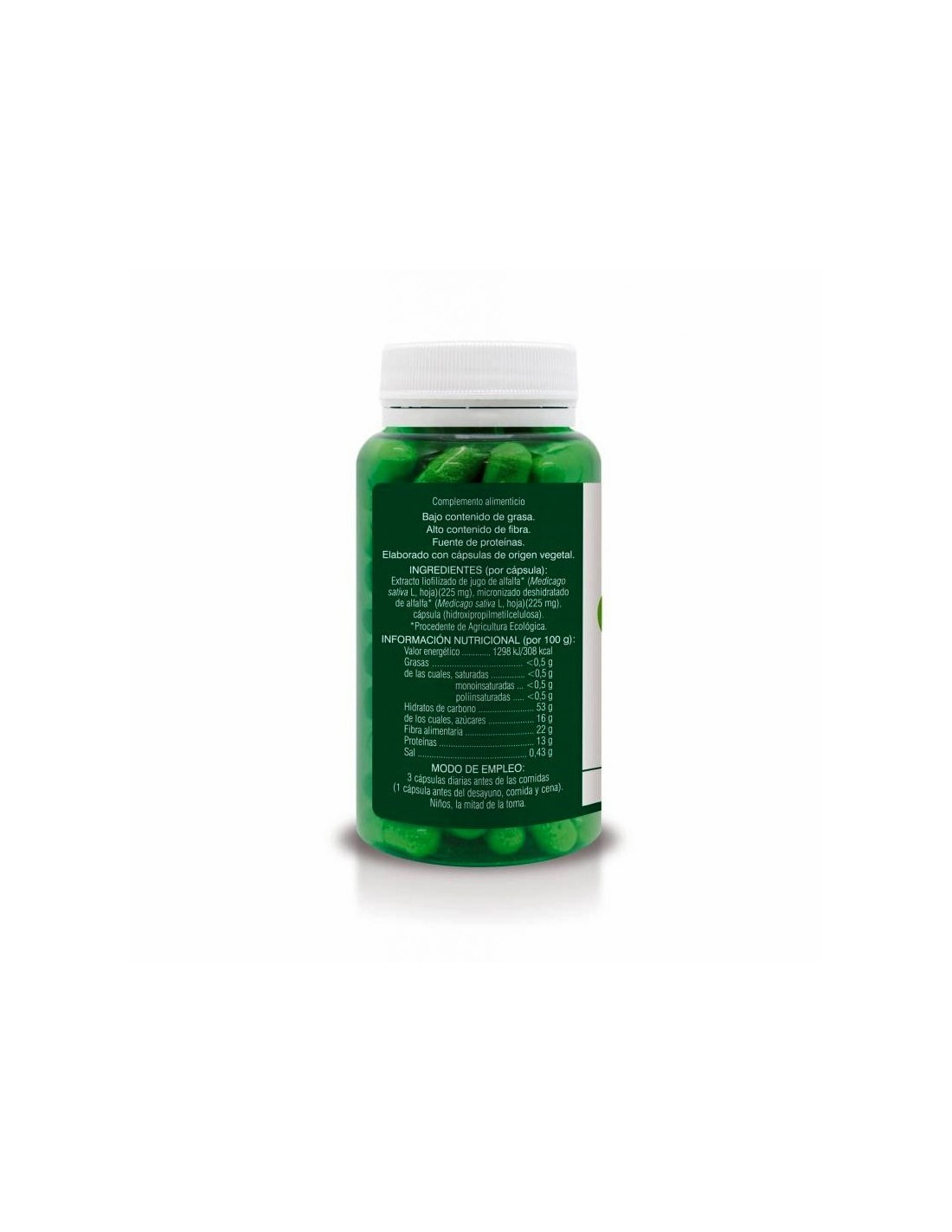 Extracto liofilizado de jugo de alfalfa* (hoja) 250 mg, micronizado deshidratado de alfalfa* (hoja) 250 mg, cápsula (hidroxipropilmetilcelulosa).