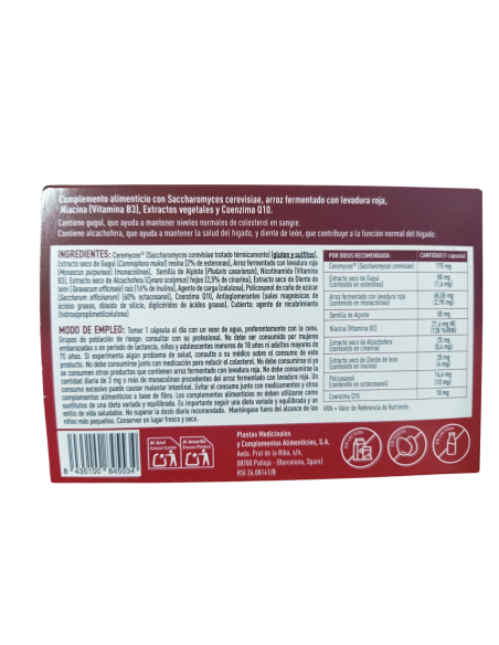Ceremyces® (Saccharomyces cerevisiae tratado térmicamente) (gluten y sulfitos), Extracto seco de resina de Gugul (Commiphora mukul) (2% de esteronas), Levadura roja de arroz (Monascus purpureus) (monacolina K), Semilla de Alpiste (Phalaris canariensis), Nicotinamida (Vitamina B3), Extracto seco de hojas de Alcachofera (Cynara scolymus) (2,5% de cinarina), Extracto seco de raíz de Diente de león (Taraxacum officinale) (16% de inulina), Agente de carga (celulosa), Policosanol de caña de azúcar (Saccharum officinarum) (60% octacosanol), Coenzima Q10, Antiaglomerantes (sales magnésicas de ácidos grasos, dióxido de silicio, diglicéridos de ácidos grasos). Cubierta: agente de recubrimiento (hidroxipropilmetilcelulosa).