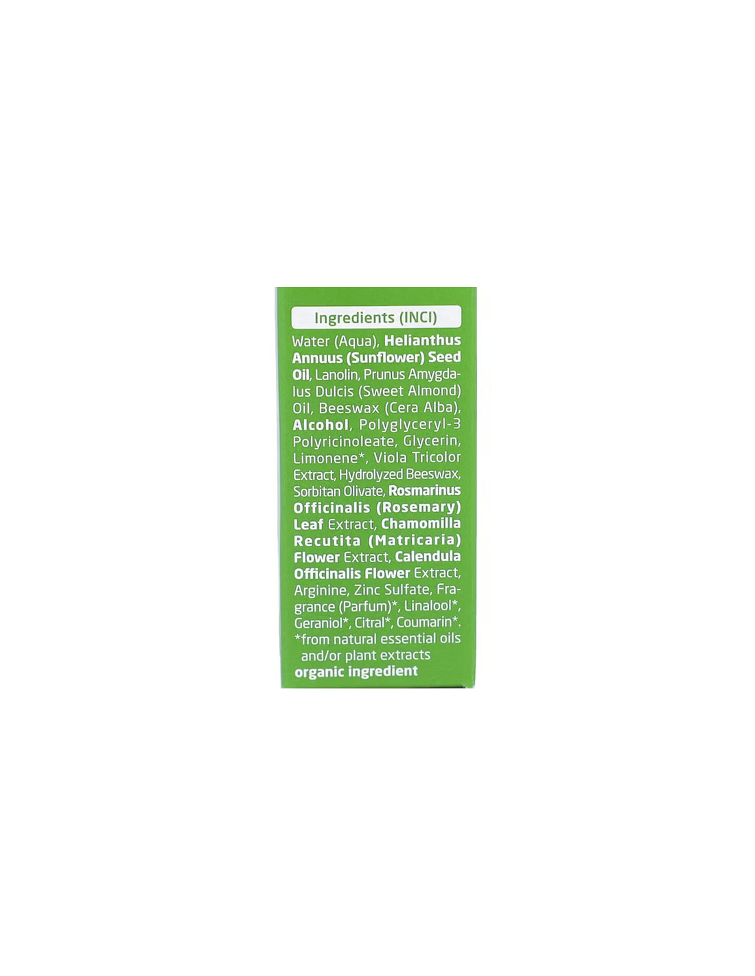 INCI: Water (Aqua), Helianthus Annuus (Sunflower) Seed Oil, Lanolin, Prunus Amygdalus Dulcis (Sweet Almond) Oil, Beeswax (Cera Alba), Alcohol, Glyceryl Linoleate, Hydrolyzed Beeswax, Limonene*, Viola Tricolor Extract, Fragrance (Parfum)*, Rosmarinus Officinalis (Rosemary) Leaf Extract, Chamomilla Recutita (Matricaria) Flower Extract, Calendula Officinalis Flower Extract, Cholesterol, Linalool*, Geraniol*, Citral*, Coumarin*.