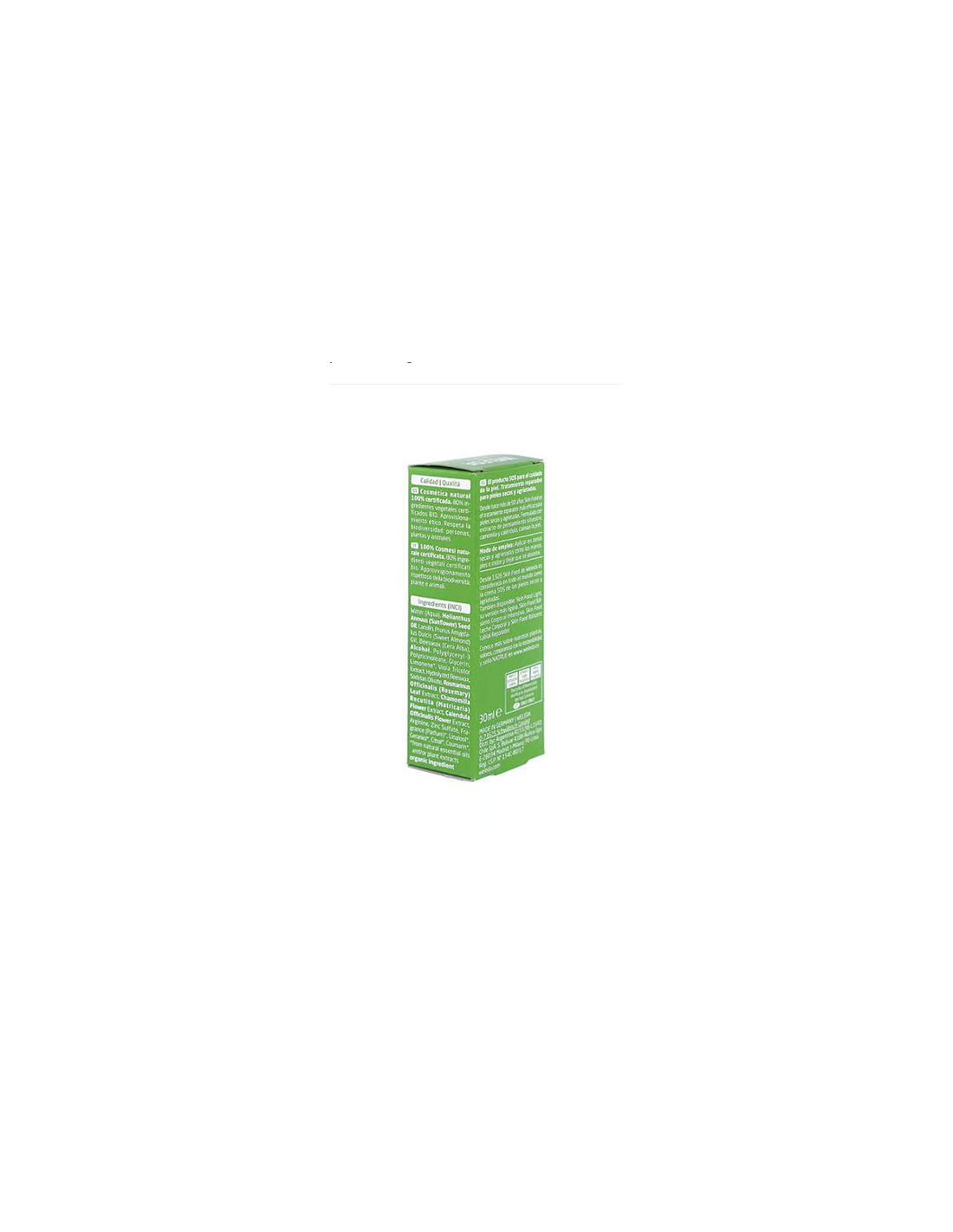 Agua, aceite de girasol, lanolina, aceite de almendra dulce, alcohol, cera de abeja, gliceril linoleato (emulgente natural obtenido de aceites vegetales), cera de abeja hidrolizada, aceites esenciales naturales, extracto de pensamiento silvestre, extracto de hojas de romero, de manzanilla, de caléndula.