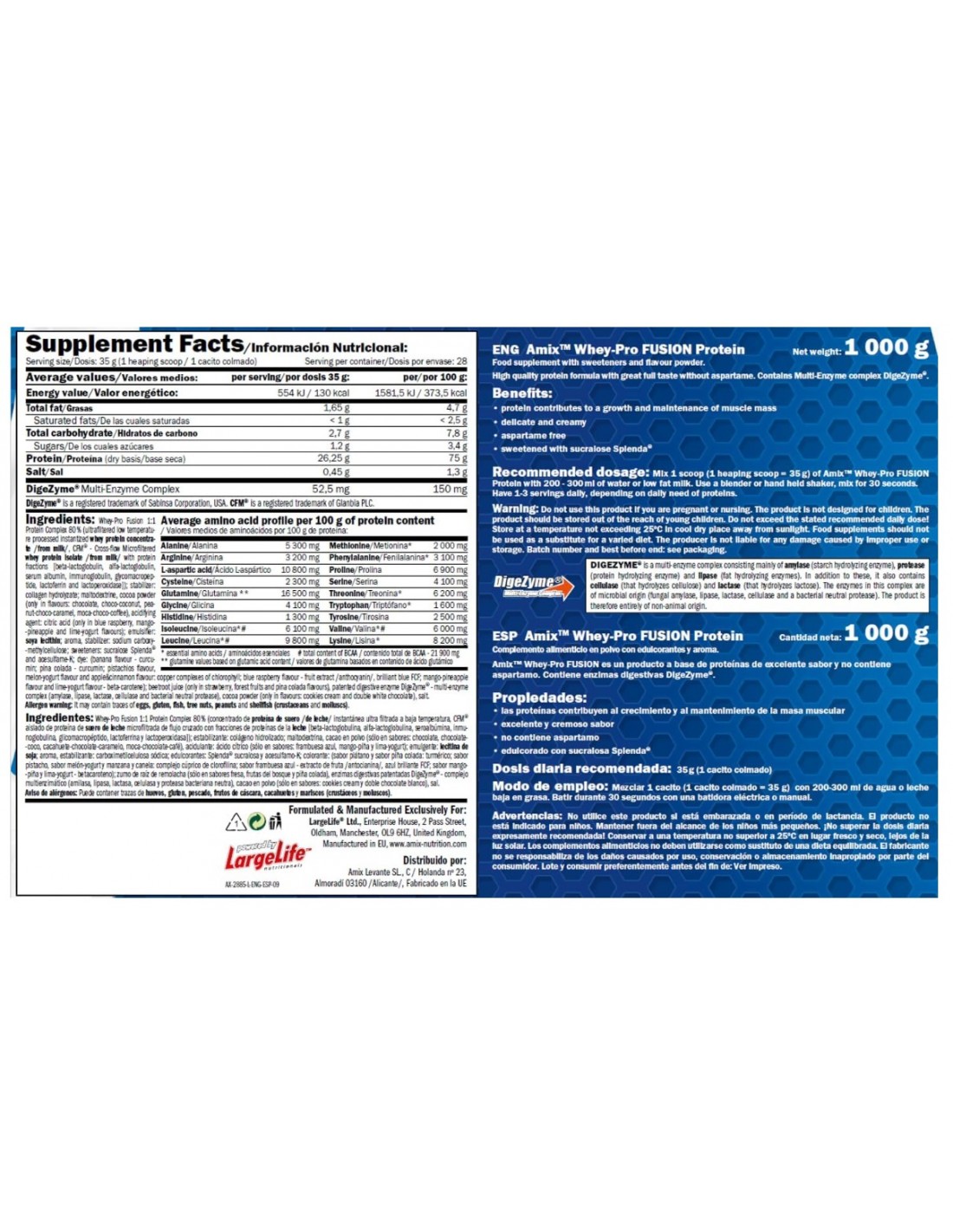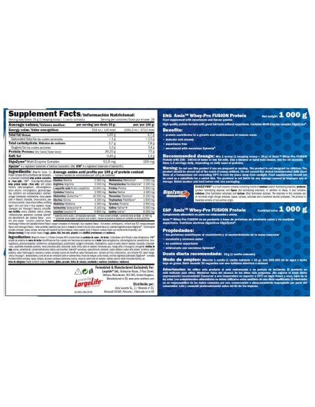 Ingredientes: Proteína Ultra Filtrada a baja temperatura instantánea Concentrado de Proteína de Suero de leche, CFM® Proteína Aislada de Suero con fracciones de proteína de leche, cacao en polvo (solo en sabor chocolate), estabilizante: goma xantana y goma guar: emulgente: lecitina de soja: aroma, edulcorante Splenda® sucralosa y acesulfamo-K : enzimas digestivas patentadas DigeZyme® – multi complejo enzimático (amilasa, lipasa, lactasa, celulasa, proteasa bacteriana neutra)