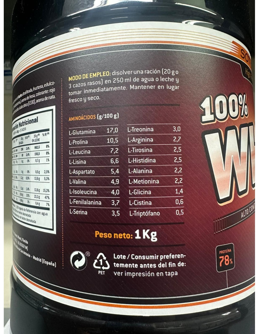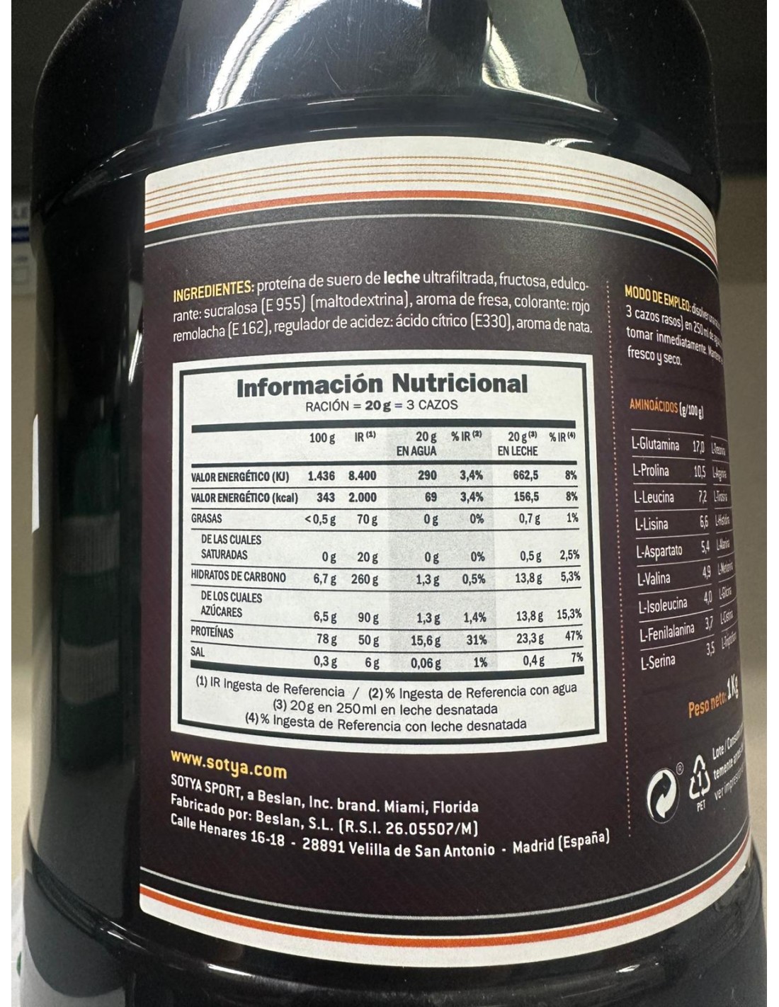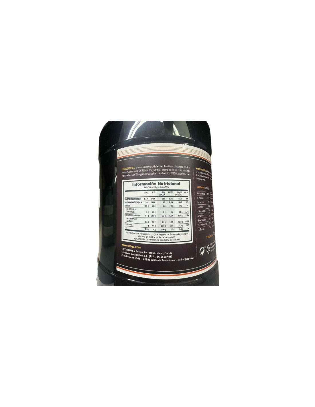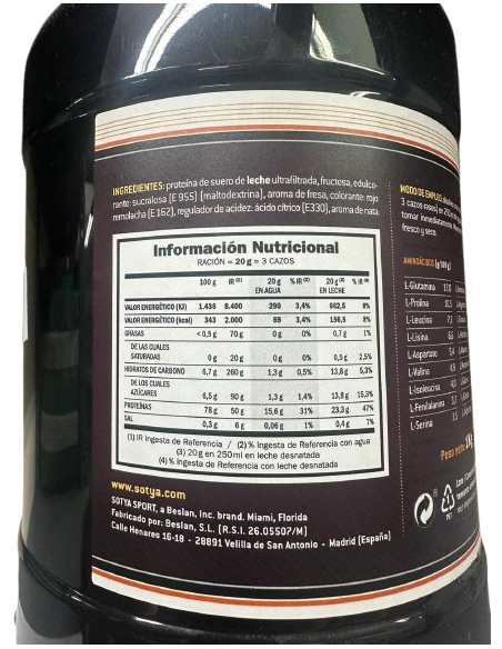 L-alanina 4,1 L-arginina 7,2 Acido L-aspártico 11,1 L-Cistina 1,2 Acido L-Glutamico 18,5 L-Glicina 4,0 L-Histidina 2,4 L-Isoleucina 4,5 L-Leucina 7,7 L-lisina 6,1 L-Metionina 1,4 L-Fenilalanina 5,0 L-Prolina 5,0 L-Serina 5,3 L-Treonina 3,6 L-Triptófano 1,1 L-Tirosina 3,7 L-Valina 4,5 Aislado de soja no GMO (93%), fructoligosacáridos, sucralosa y aroma de fresa.